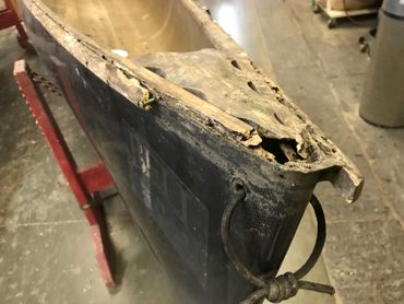 Clean-off any accumulation of dirt, or gummy-goo (detergent and fine pot scrubby works as well as anything). Cut off stray fiberglass or Kevlar threads. File the top edge of any rough spots. Every canoe repair will go more smoothly on a clean boat.